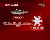 За державними стандартами шар глазурі не повинен бути більшим, ніж 4 відсотки від маси рибного філе. У нашому випадку - він становив 17%. Отже, 17 - 4 = 13 % від ціни - це вартість льоду. Філе трІски ми купували за ціною 33 грн 56 копійок. Морожена вода рАзом із рибою продається за 4 гривні 30 копійок з кожного кілограма.