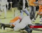Баскетбольний матч у американському університеті закінчився масовою бійкою. Спочатку стосунки між собою з'ясовували гравці команд. Та згодом на майданчик почали вибігати і уболівальники.